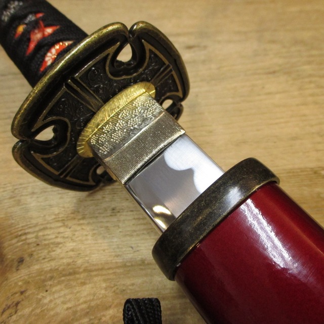 とよとみひでよしごしらえ、いちごひとふり。 秀吉的な赤・金の華美な拵はいかにも本物が現存してそうだけどメーカーオリジナル。 わりと昔からある(武装商店開店の2005年時点であった)モデル。 「一期一振(いちごひとふり)」は今やそこそこメジャーなので読めるようになっておこう。テストに出るぞ。いっきいっしんじゃないぞ。 ※美術刀は装飾目的の模擬刀剣です。振り回すような用途に耐えるものではありません。 ・鞘込み全長:約105cm 刃長:約74cm ・鞘込み全重量:約1,2kg 抜き身重量:約0,9kg ※製造ロット等により若干の個体差があります 刀身:亜鉛合金 柄:樹脂製 柄糸:人絹 鍔:合金製 鞘:木製 製造:日本(岐阜県関市)