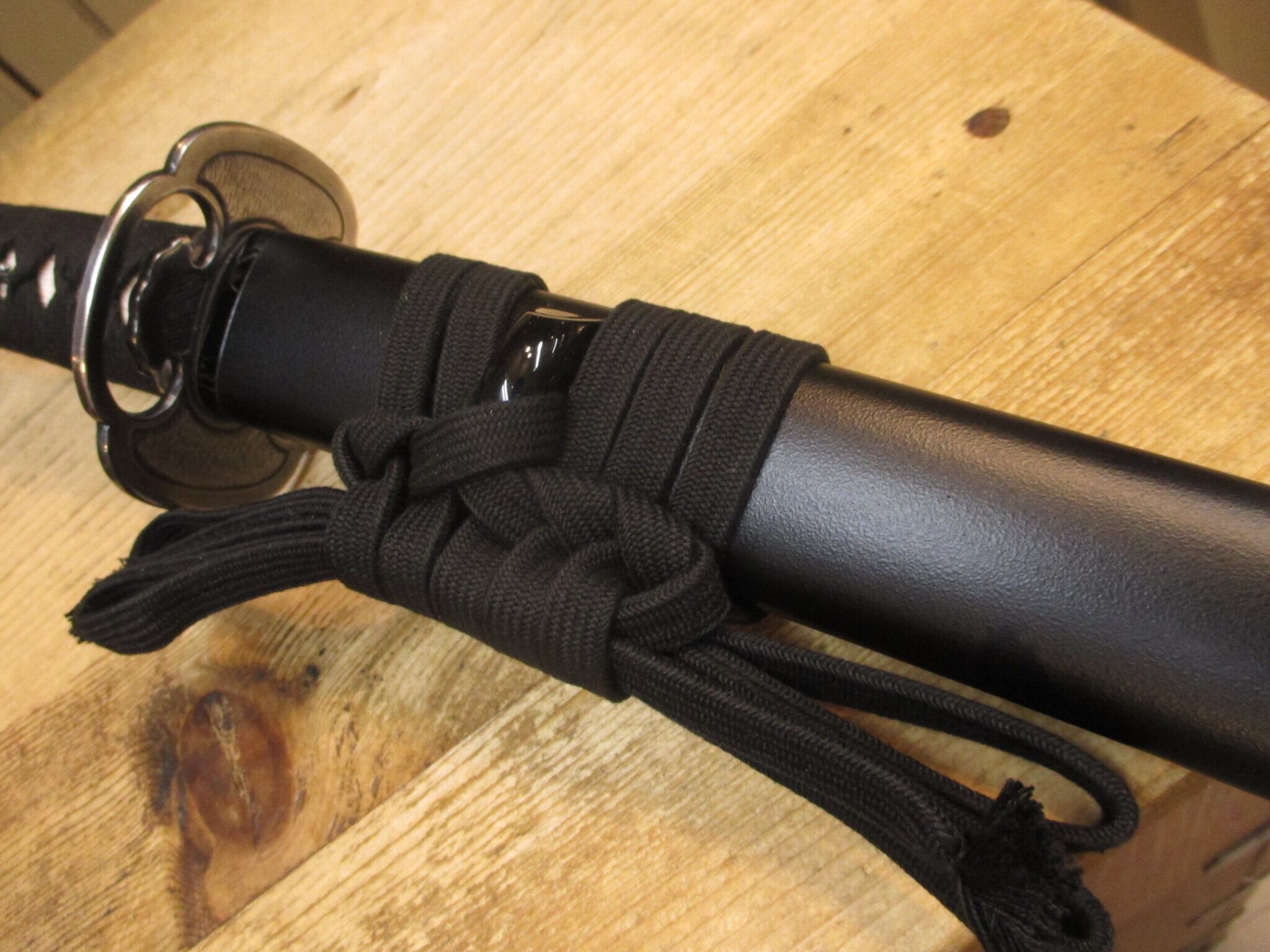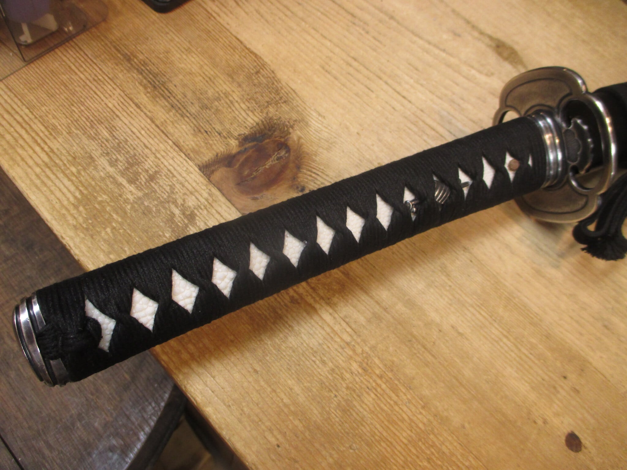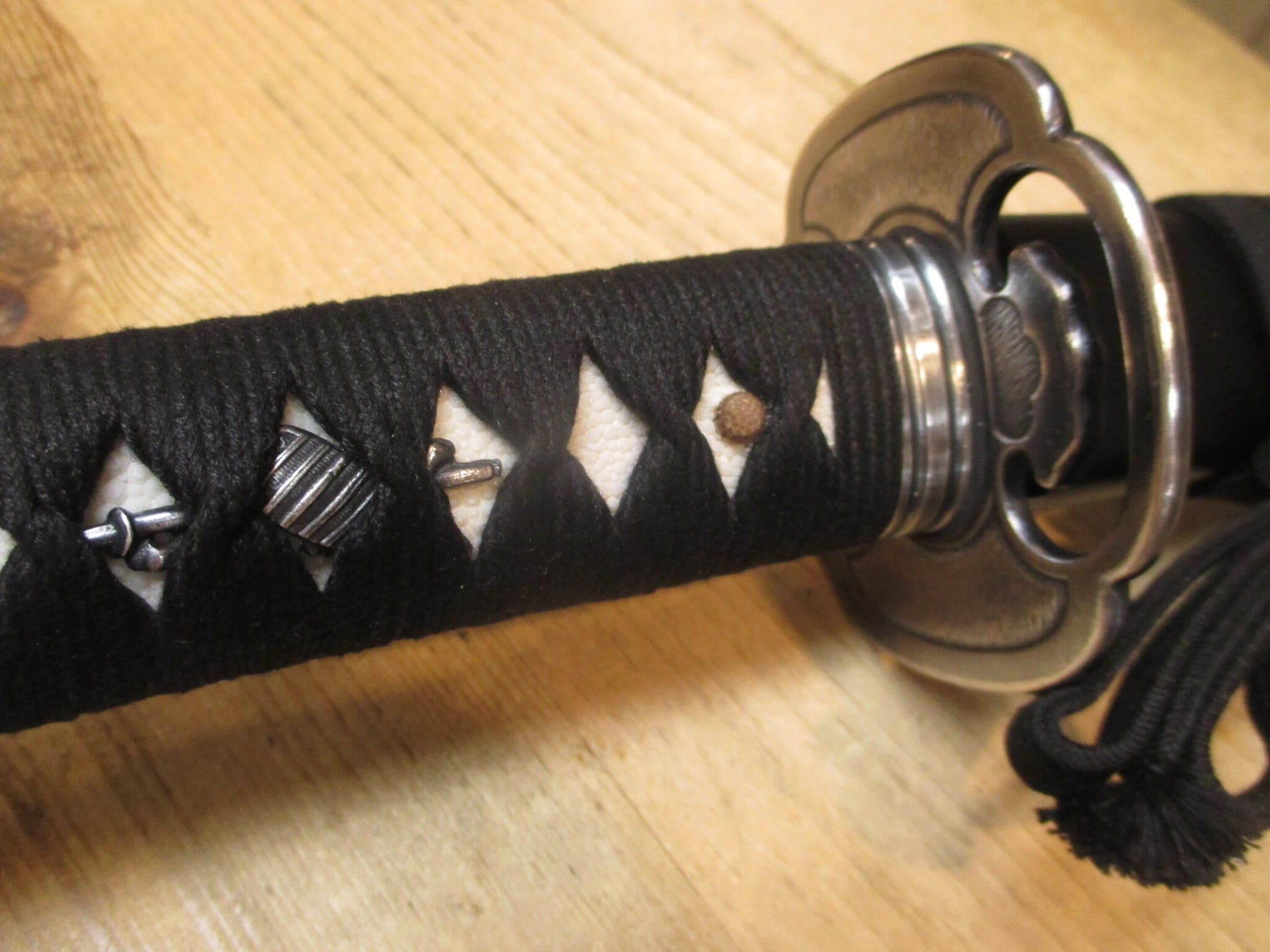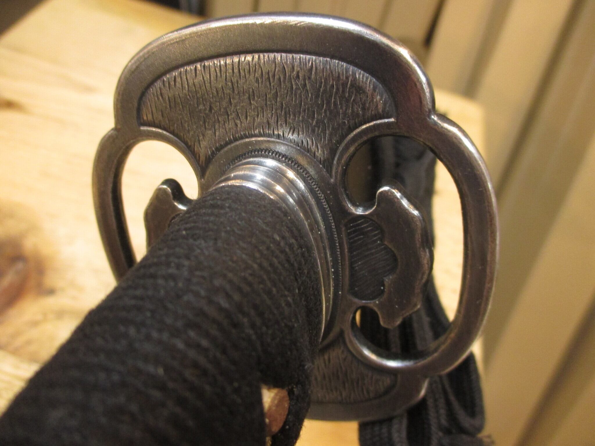 鞘黒石目、黒糸。縁頭は銀肥後山道、目貫鎧袖図。