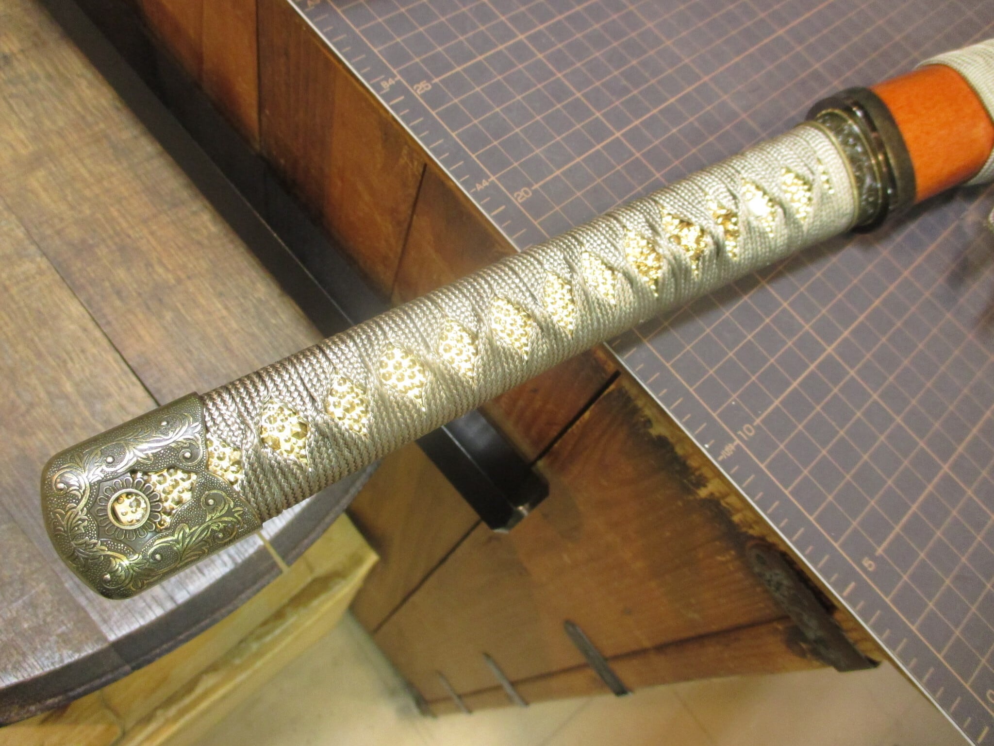 金鮫、金馬目貫。灰糸、古美太刀金具。