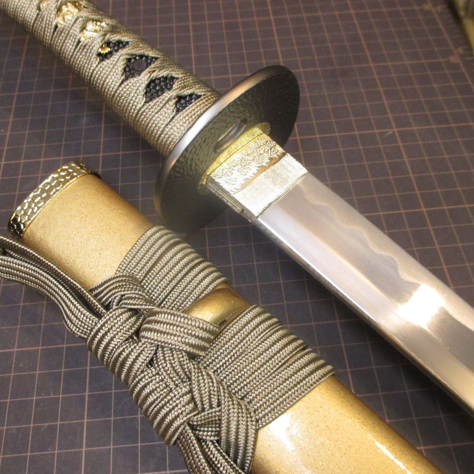 金の鞘に灰の柄巻、柄金具は縁と頭で色違いと、わりと手間のかかった仕様の一振り。