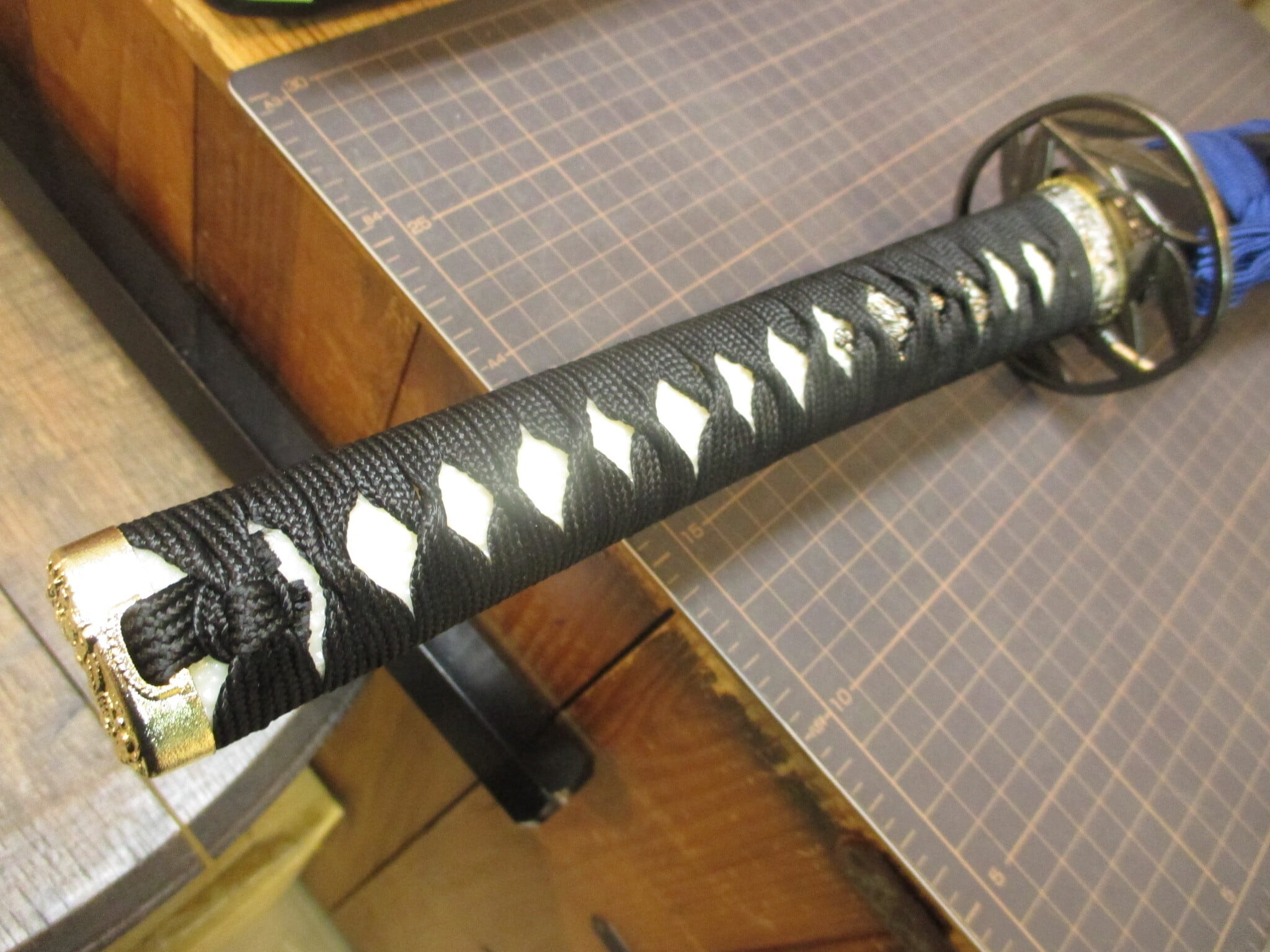 全体的に普通なようで柄金具のうち柄頭だけ色が違うという絶妙にめんどくさい仕様が特徴。ちなみに模擬刀剣ではあまりそういう仕様はありませんが、本歌(真剣)の拵では結構あります。