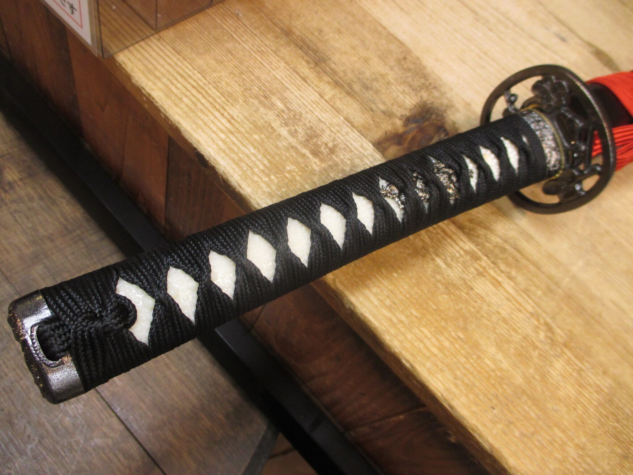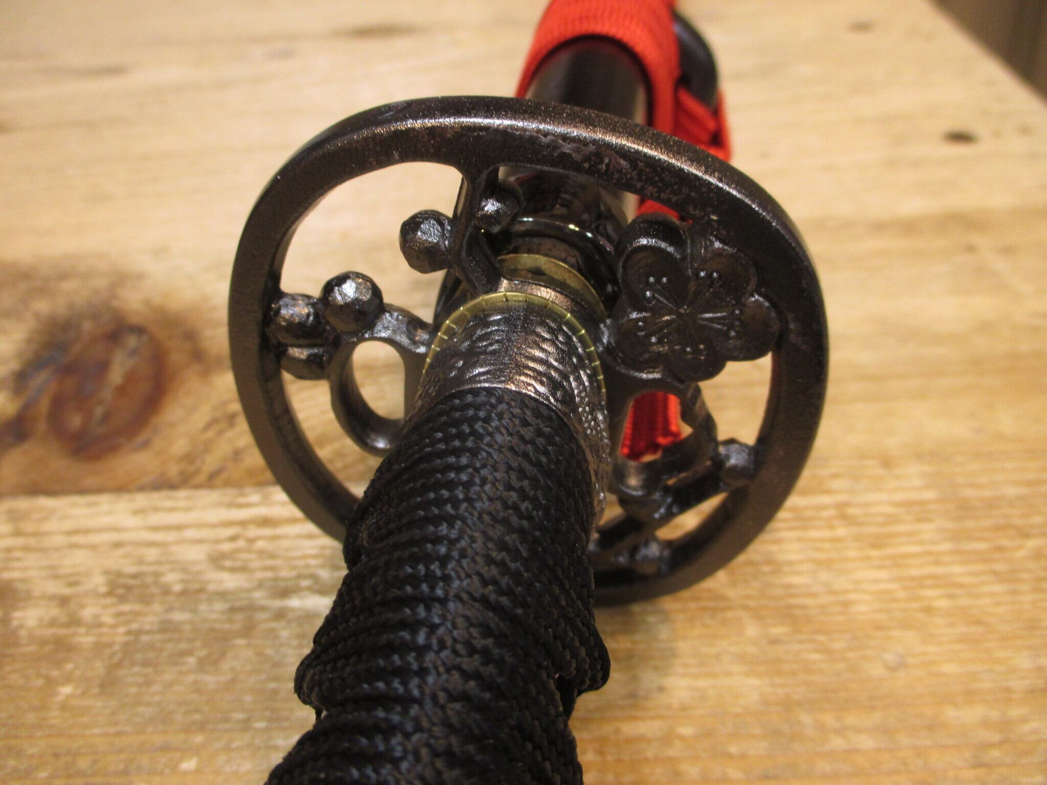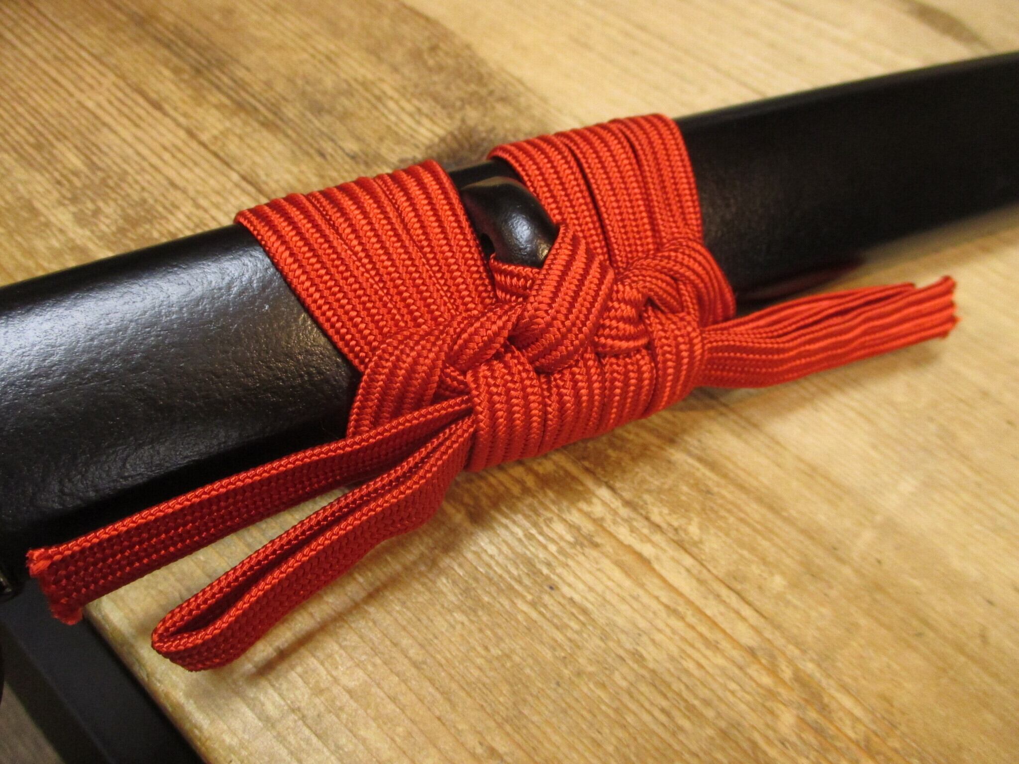 元々居合刀用の下緒を採用していた山姥切国広ですが、美術刀メーカーの赤下緒の色合いがロットによる変化で明るくなり、オレンジに近くなったのでそれを使った廉価バージョン。