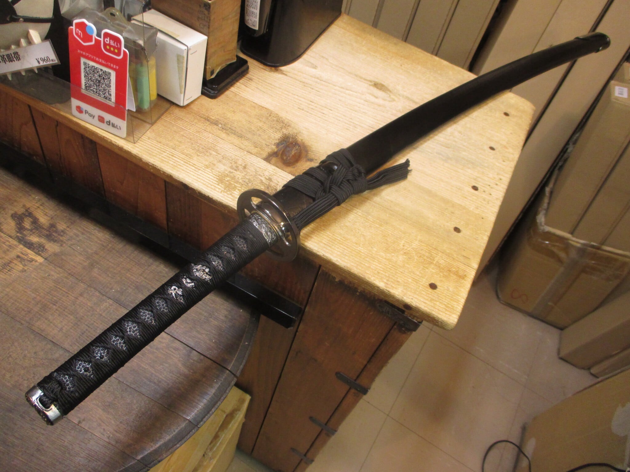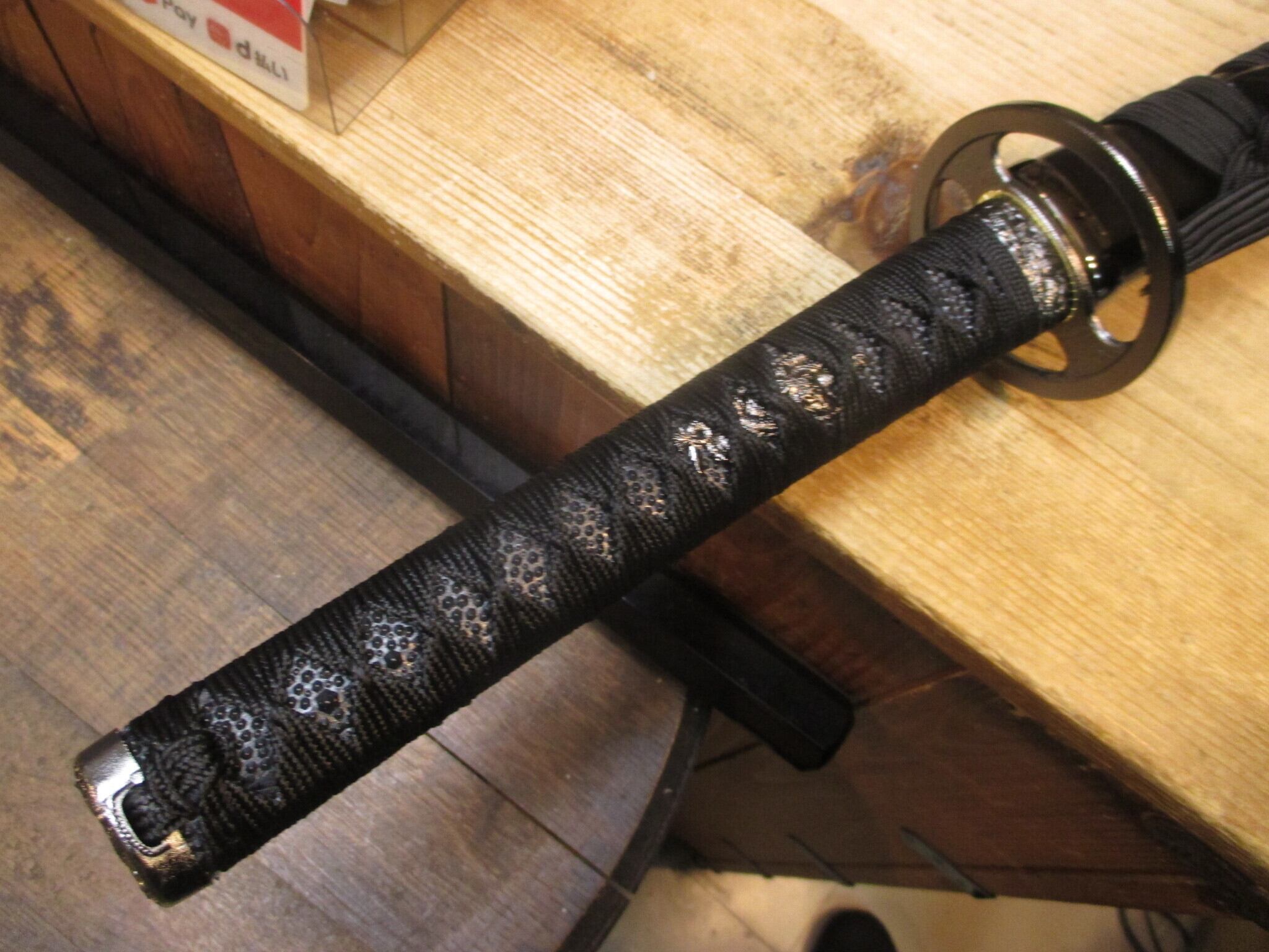 一見黒くて地味だけど、蛭巻に刷毛目風の鞘とかコジリとか、小技の効いた拵。