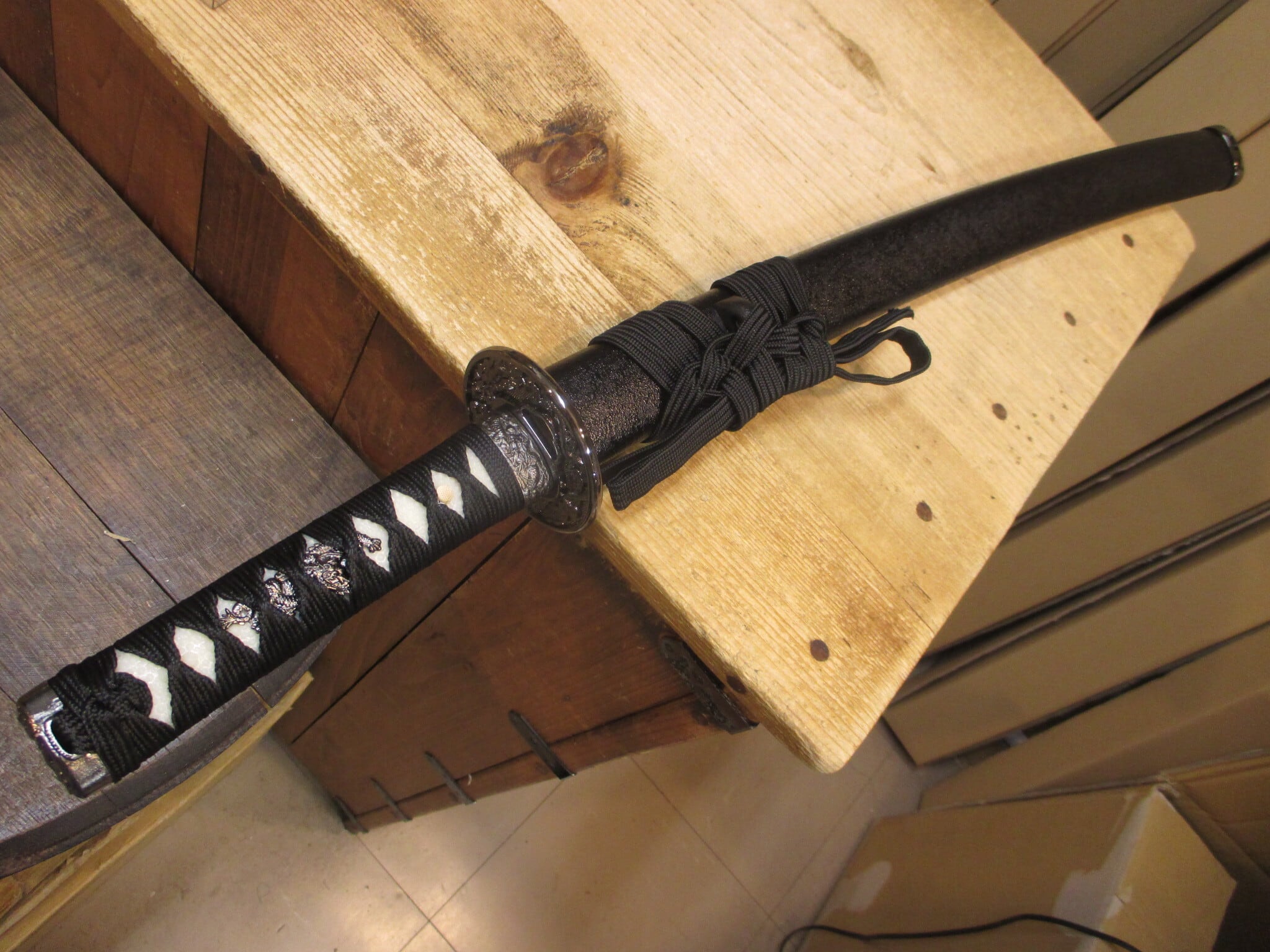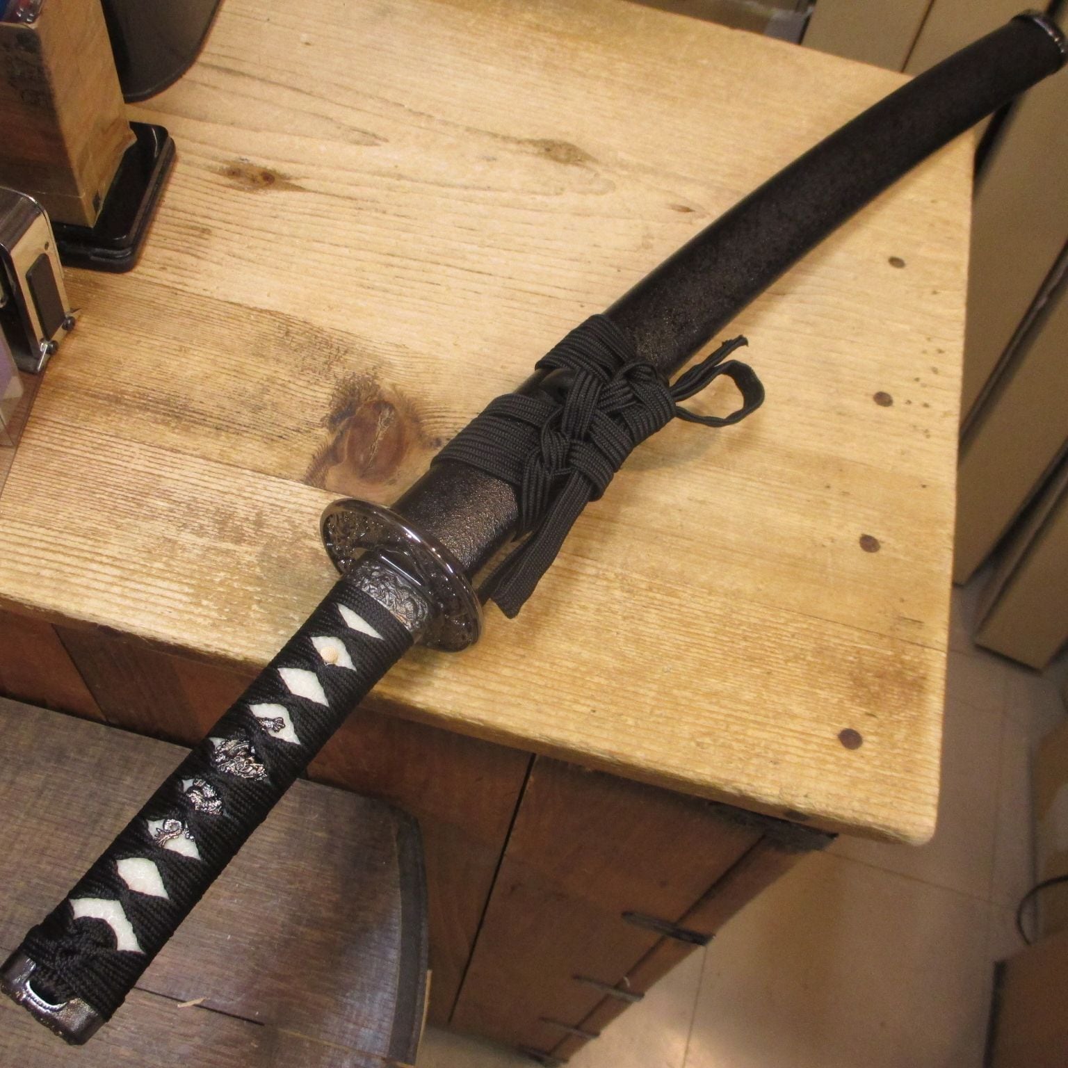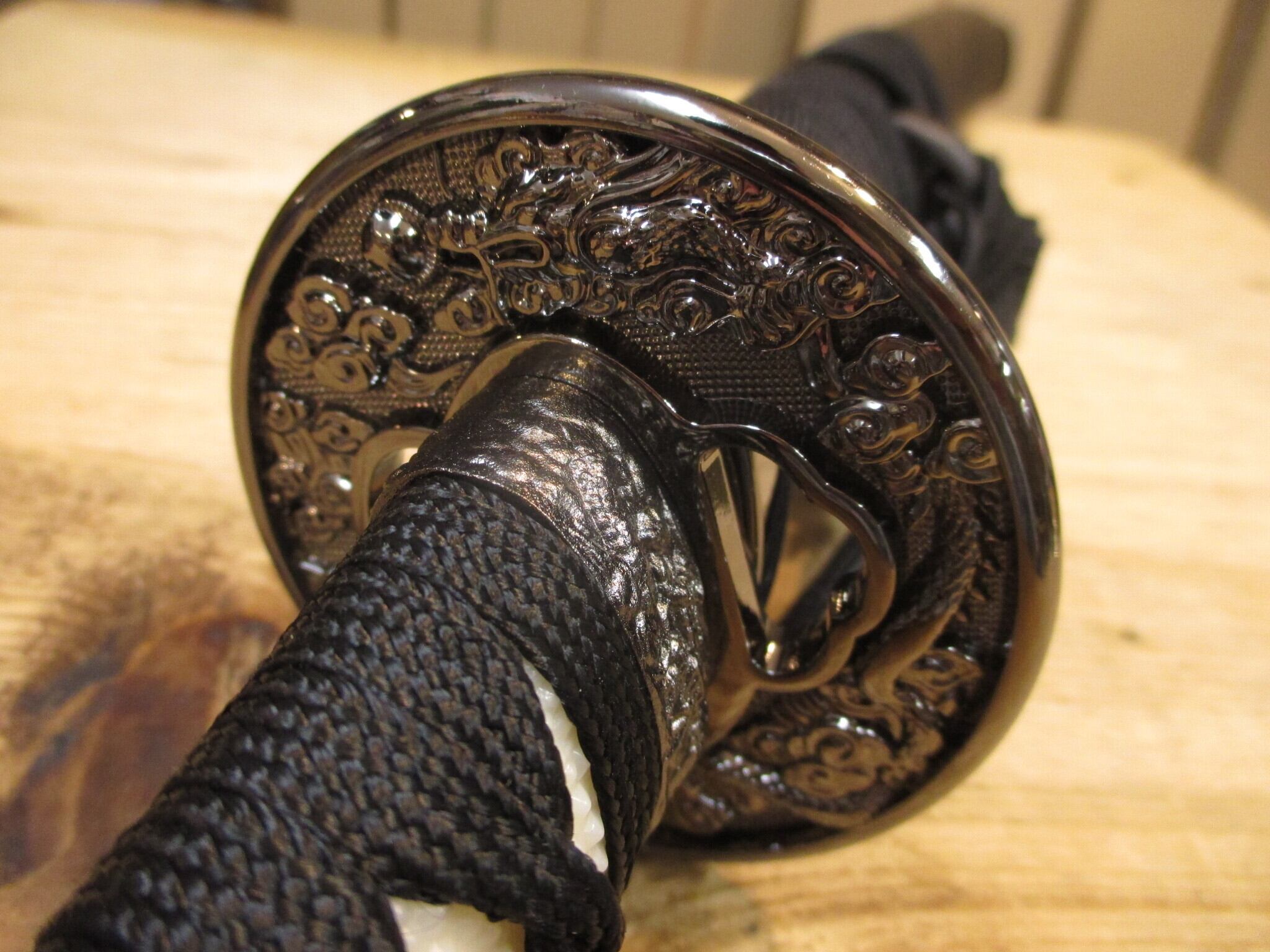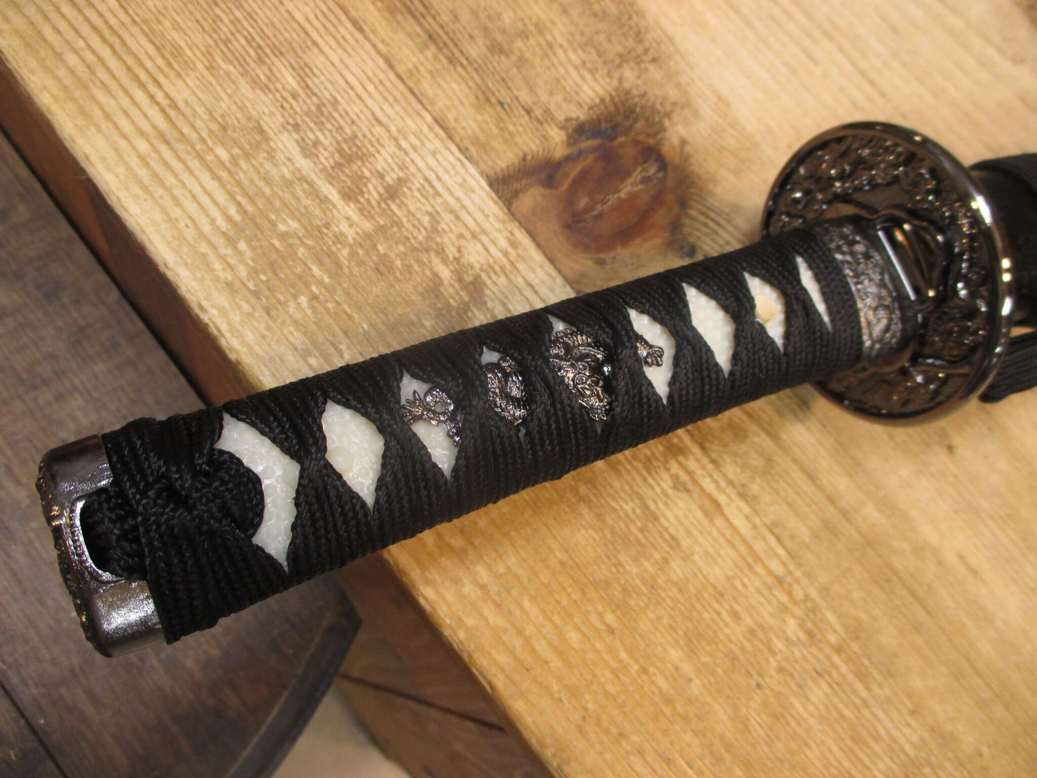 黒石目の小さい方、つまり脇差。刃長約一尺五寸。拵は大と同作で、鍔は一回り小振りで目貫/縁頭全て龍で揃ってます。大小並べるとステキですが、狭い所で単独で飾るのもよいでしょう。