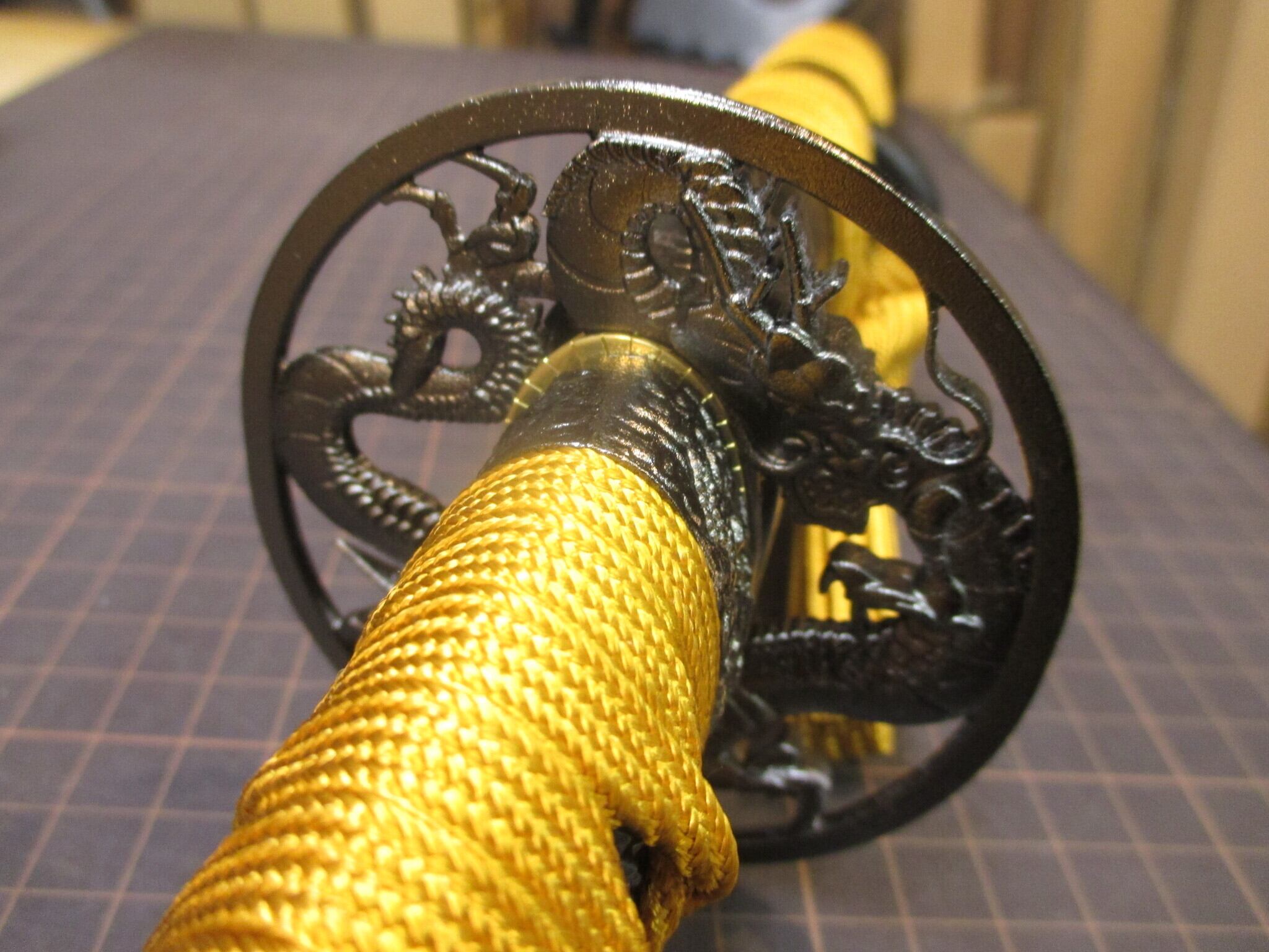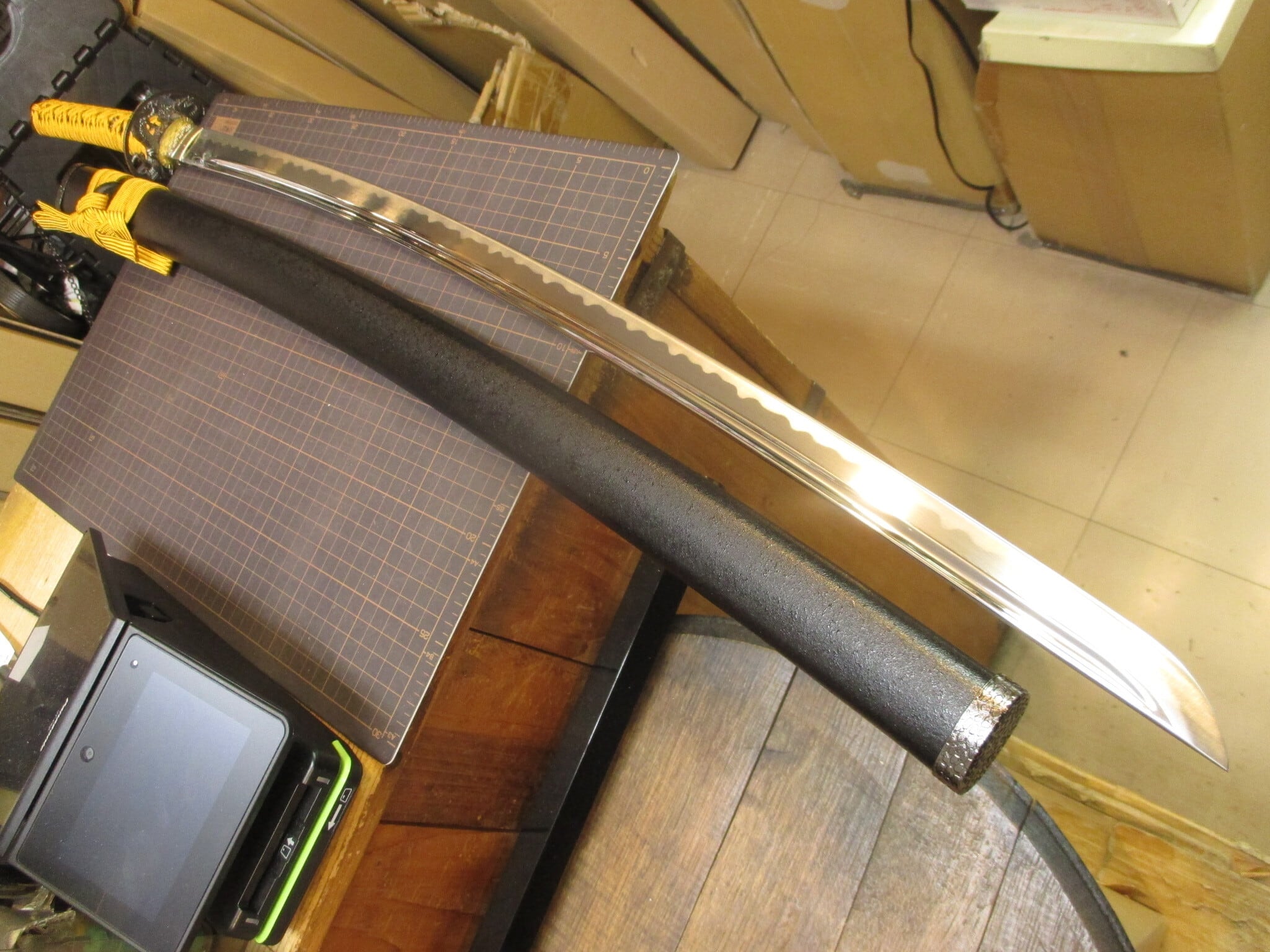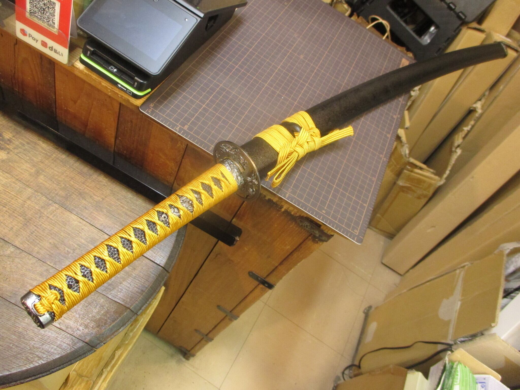 真贋の話はその辺に置いといて、近藤の虎徹といえば柄糸が茶〜黄色系のイメージが強いのは時代劇由来みたいですね。同作の小(脇差)も有るよ。